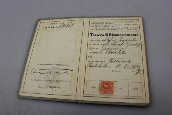 Tessera da iscritto OND del 1929, VII° E.F. Buono stato di conservazione.
