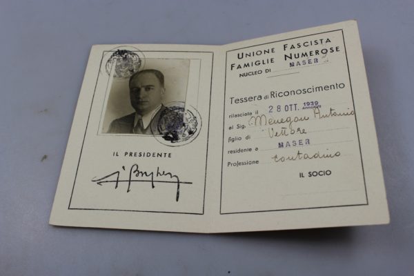 Tessera da iscritto all’ Unione Fascista Famiglie Numerose per l’anno XVIII° E.F. della sezione di Maser (TV),documento completo di foto. Buono stato di conservazione.