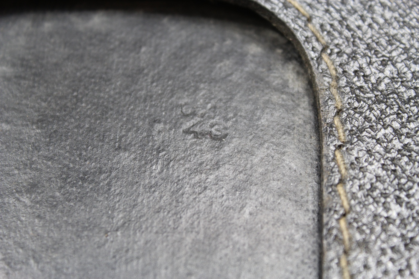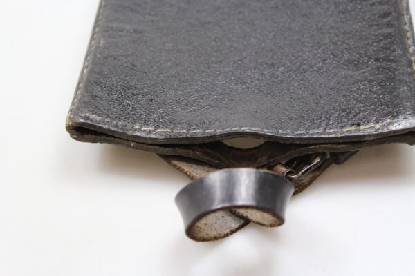 Porta vanghetto rigido della Wehrmacht, versione tarda fatta in cuoio e presstoff, marcata dxc 43 e con Waffenamnt. Poco usato, perfetto stato di conservazione.