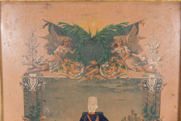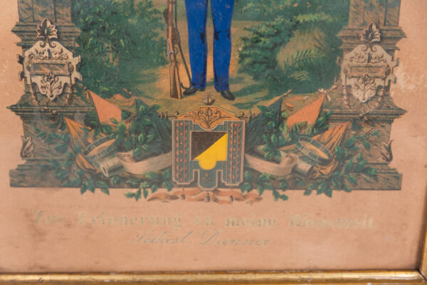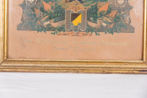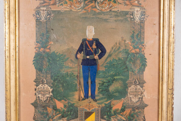 Quadro raffigurante soldato Tedesco della Prima Guerra Mondiale, eseguito in maniera particolare, cioè uniforme ed equipaggiamento a colori, applicata la foto della faccia del proprietario.Dimensioni cm 42 x 30, cornice e tutto il resto in accettabili condizioni.