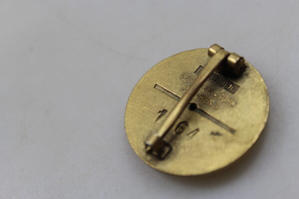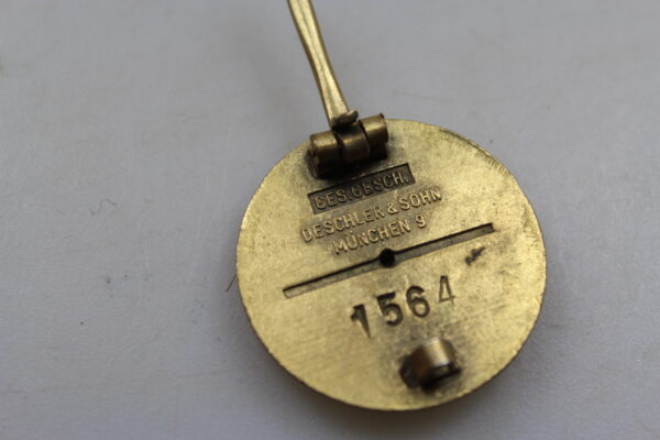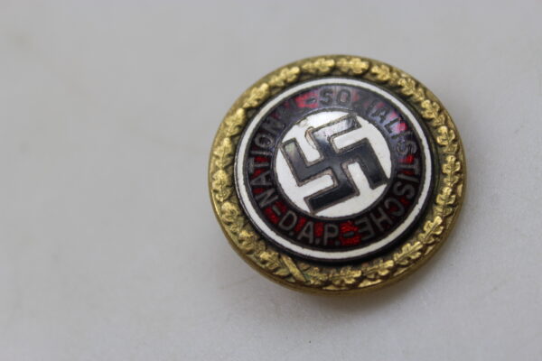 Replica distintivo NSDAP in oro, assegnato a discrezione di Adolf Hitler, ai primi 100.000 iscritti al partito. Ottima replica fatta in due pezzi con parte centrale anteriore smaltata, parte posteriore marcata Ges.Gesch. produttore Deschler  & Sohn – Munchen e numero progressivo di conferimento. Sapientemente “anticata”, in bella patina.