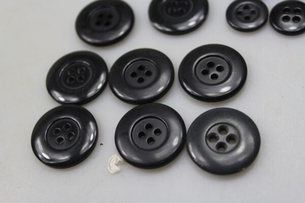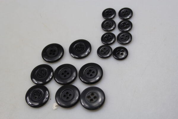 # 16 bottoni repro per uniformi Panzer, fatti in simil-bakelite nera, #8 da 22 mm di diametro e altri #8 da 14 mm di diametro. Buono stato di conservazione.