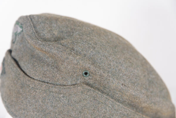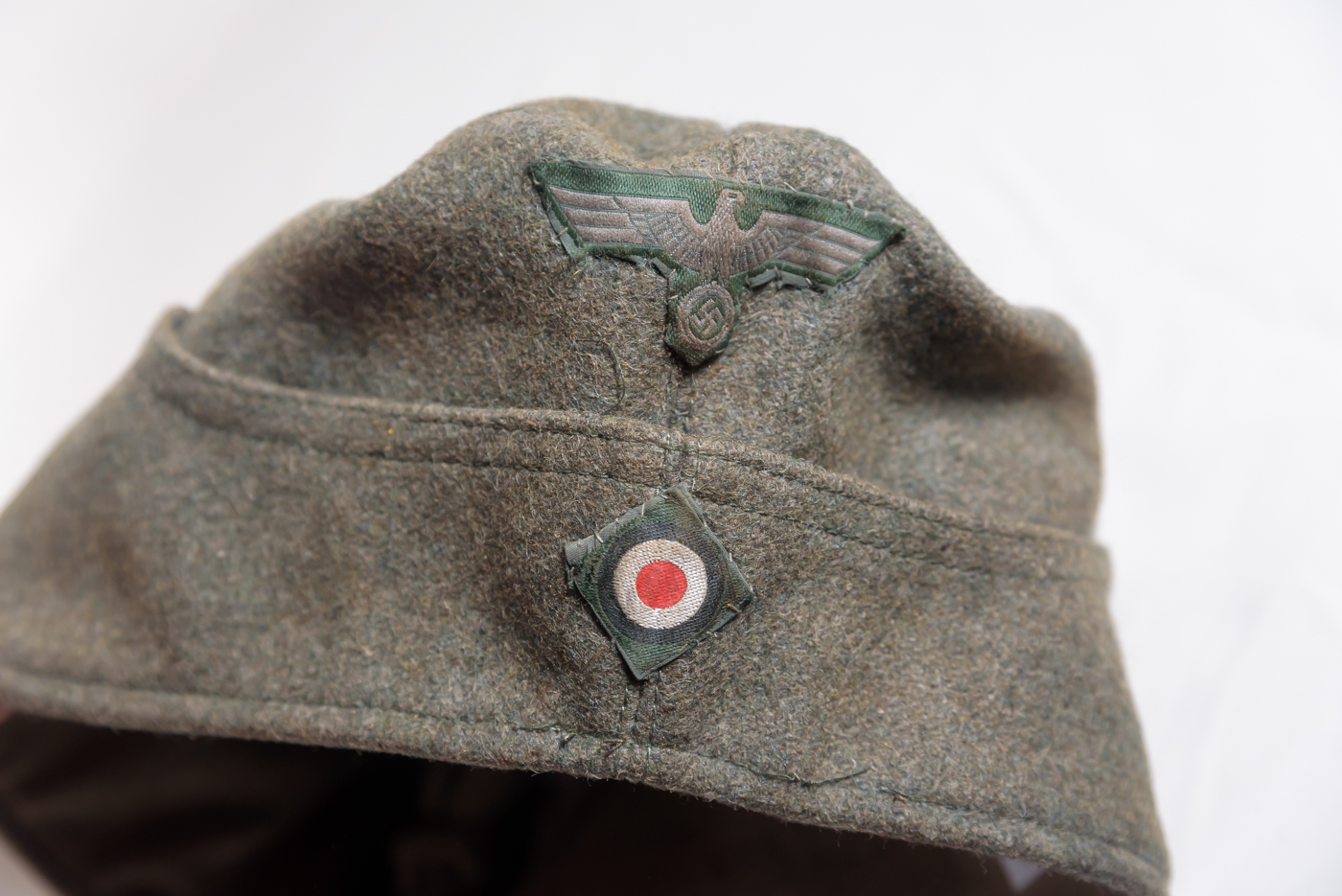 Ottima reoro di una bustina M.38 truppa Heer, fatta in panno feldgrau e completa di fregi stile Be-Vo repro perfette. “Anticata” in patina