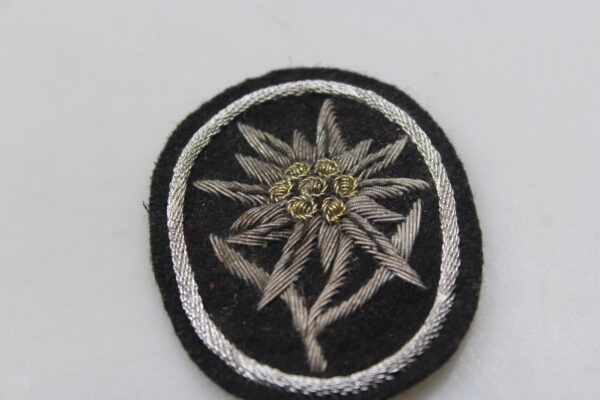 Ottima repro di edelweiss per manica da giacca per Ufficiale Gebirgsjager SS, ricamata in canuttiglia.
