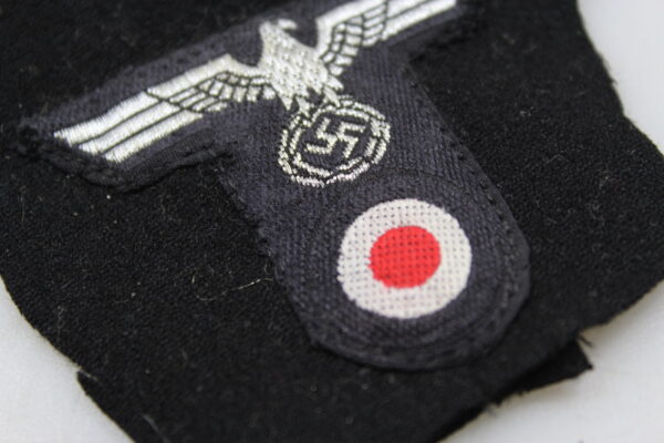 Ottima repro di un fregio a T per berretto M.43 Ufficiale Panzer, versione Be-Vo “flat-wire”, disegno e dimensioni corrette. Cucito su panno nero per renderlo più credibile e spacciandolo per originale.