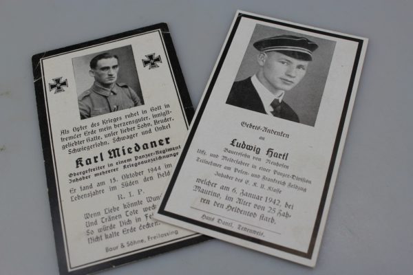 # 2 sterbebilder di due carristi – Panzer della Heer,uno caduto nel 1942 a Maurino (Russia),l’altro nel 1944 sul fronte Sud. Buono stato di conservazione.