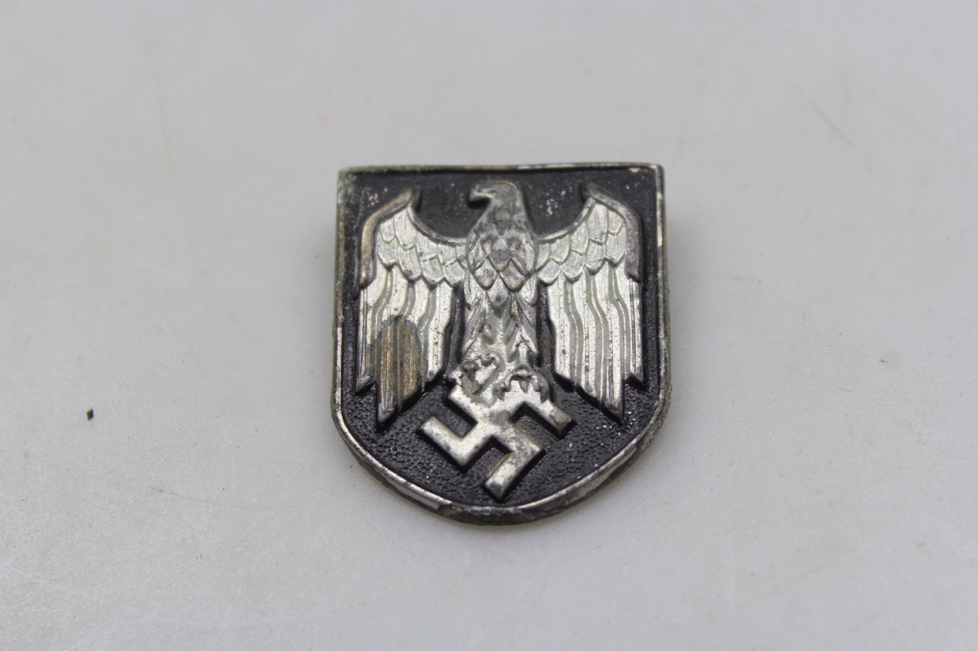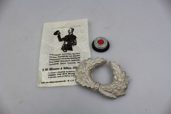 Serto e coccarda fatta in alluminio per schirmmutze da Ufficiale e NCO della Heer, con busta in carta del produttore Assmann & Sohn. Mint condition, mai usato, perfetto.