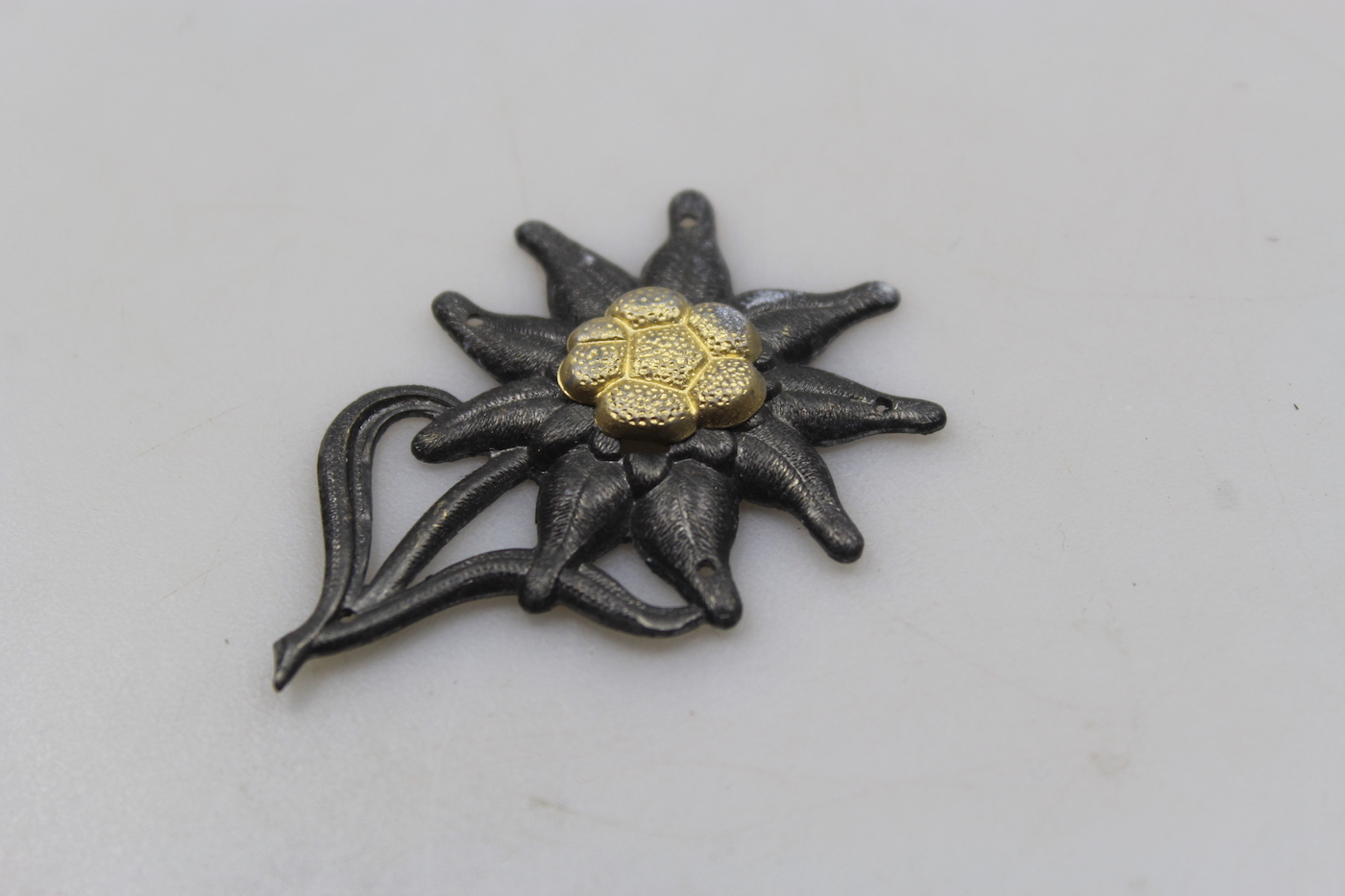 Set di fregi, aquila e coccarda, per bustina da truppa Pajnzer Heer. Aquila a “bassa visibilità”, coccarda molto particolare, ricamata nera su base verde, produzione Be-Vo. Usati, tolti da bustina, buono stato di conservazione, bella patina.