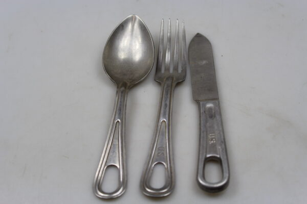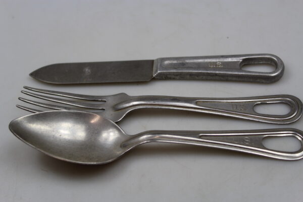Set di posate US Army della Seconda Guerra Mondiale, cucchiaio e forchetta datati 1945, coltello non datato. Usate, buono stato di conservazione.