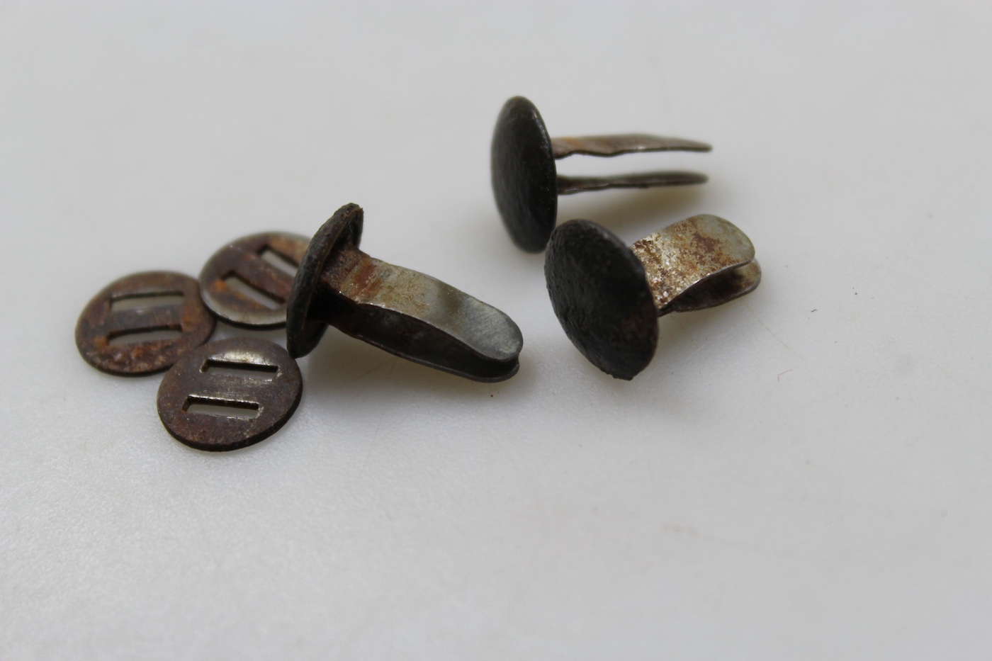 Set composto da tre rivetti e tre “ranelle” per elmetto Tedesco M.40/M.42 della Seconda Guerra Mondiale. Usati, bella patina, utilizzabili