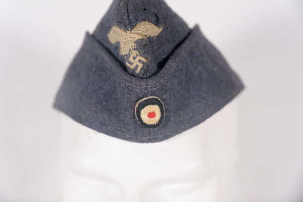 Bustina da truppa della Luftwaffe, fatta in panno blaugrau e completa dei suoi corretti fregi ricamati in cotone. Usata, buono stato di conservazione, non sono visibili marcature.