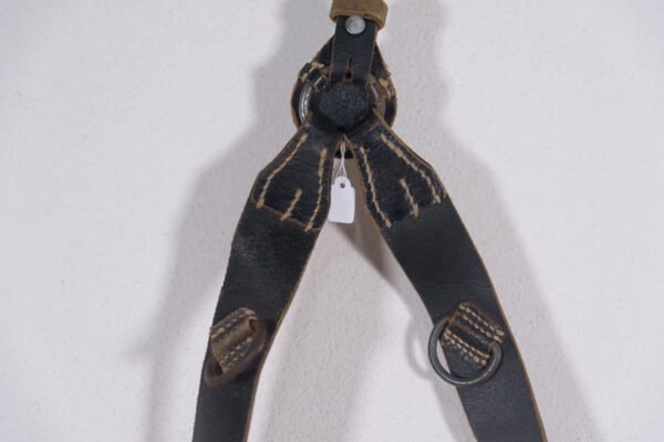 Sospensioni a Y pesanti, fatti in cuoio nero, con metalleria in ferro verniciato, variante tarda con anelli a “D” inclinati anzichè paralleli, vedi foto in dettaglio. Molto buono lo stato di conservazione, integri, esenti da grasso, creme e altro.