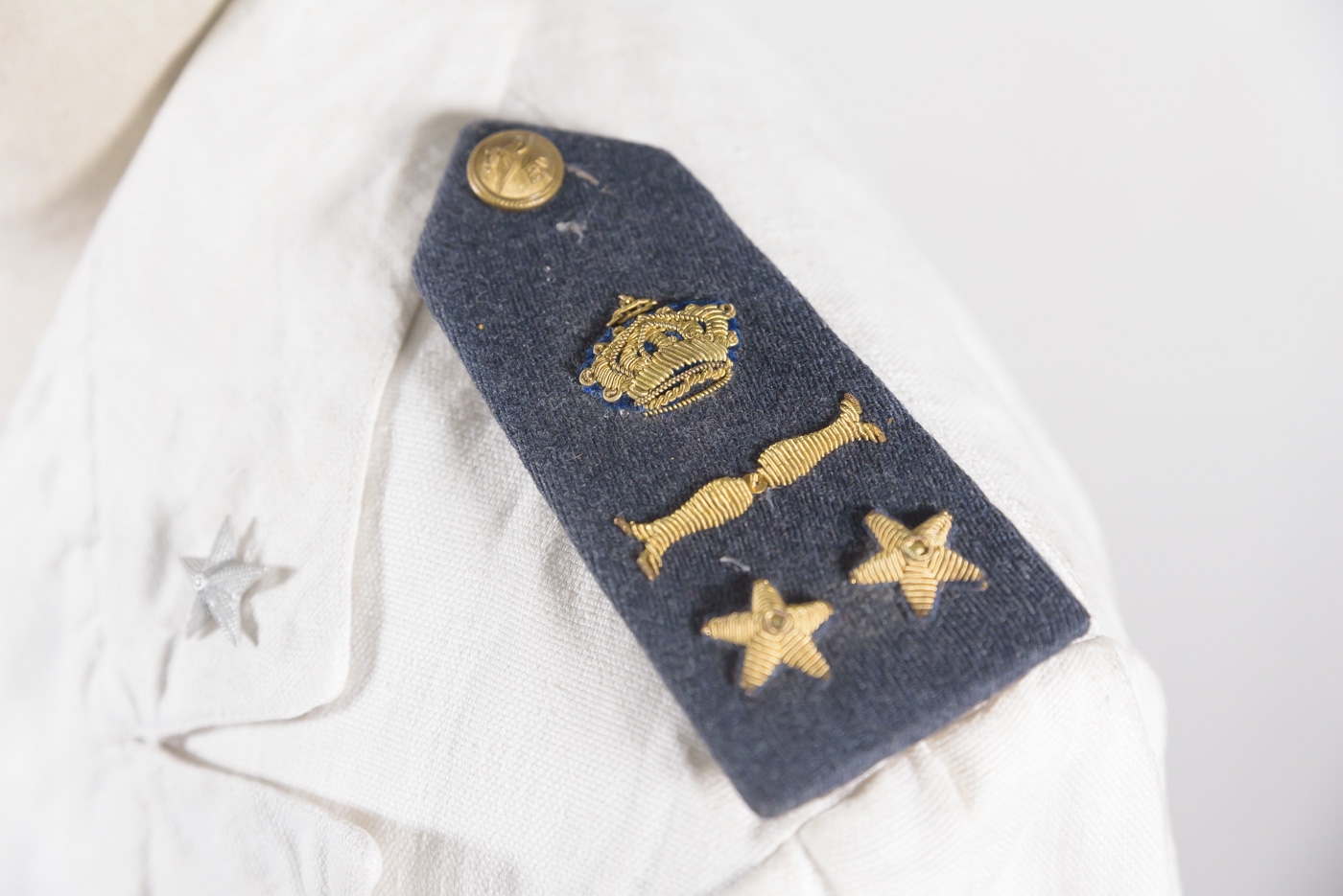 Spencer “Dinner jacket” Regia Aeronautica, fatto in tessuto tipicamente estivo, completo dei suoi corretti attributi, spalline da Tenente Pilota della Regia Aeronautica. Usato, buono stato di conservazione.