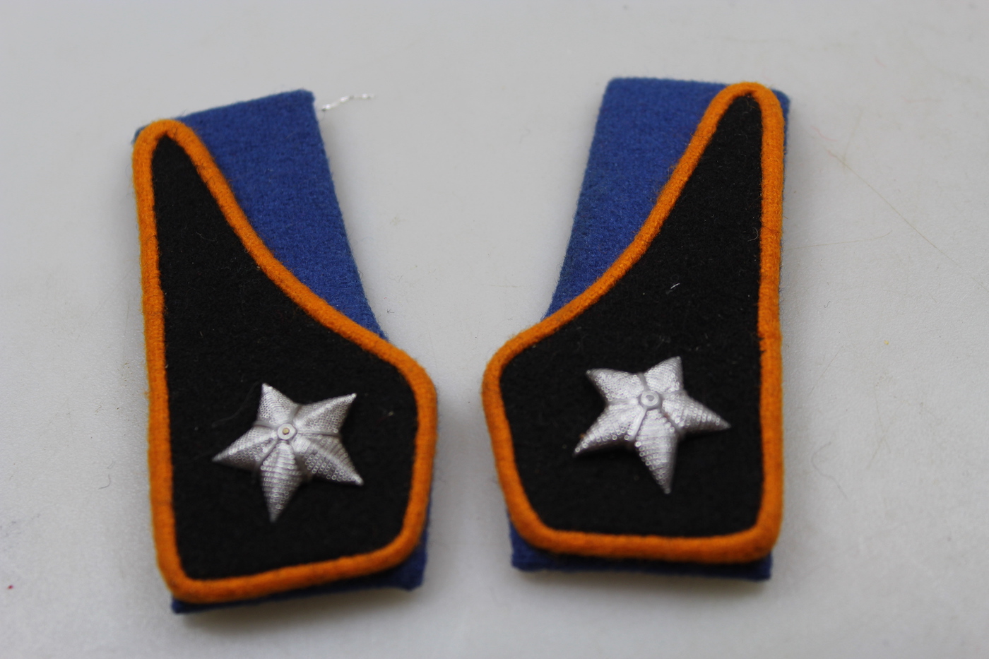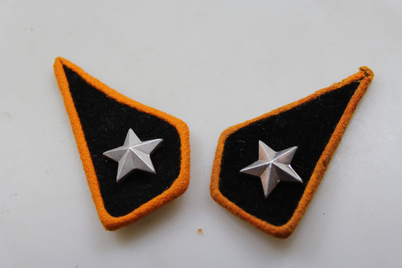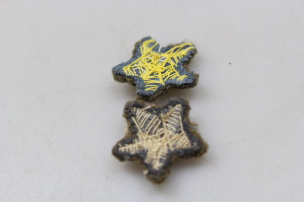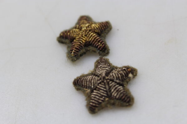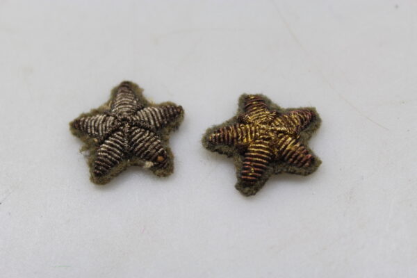 Coppia di stellette da bavero, misura media ricamate in canottiglia su base grigio/verde, per Ufficiale REI WW1. Usate, buono stato di conservazione.