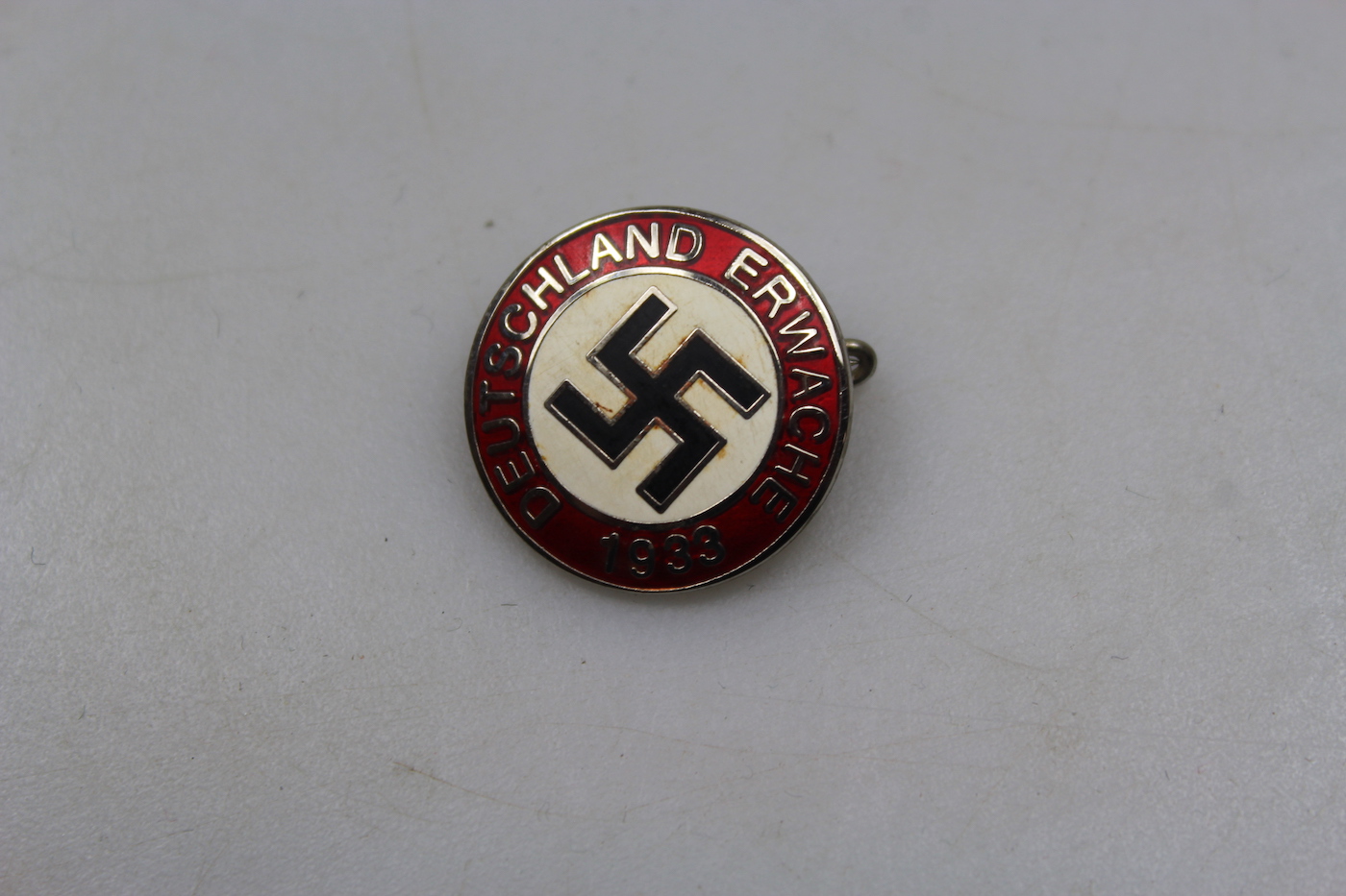 Super repro di un pin smaltato NSDAP, con motto “Deutschland Erwache 1933”. Marcato RZM M1/129, produttore Seiler & Comp -Geldem. Bella Patina.