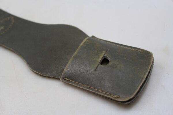 Taschetta in cuoio grigio verde per fodero della baionetta 91 della Seconda Guerra Mondiale. Usata, buono stato di conservazione.