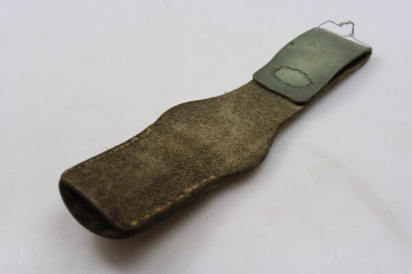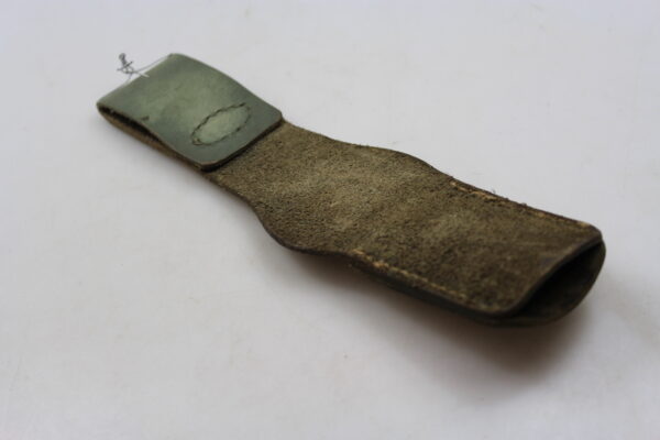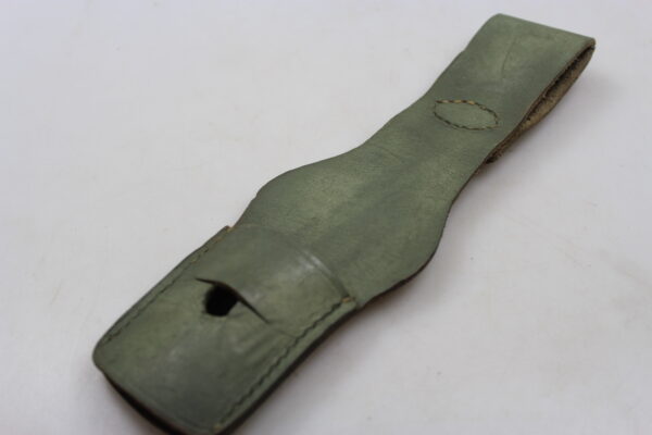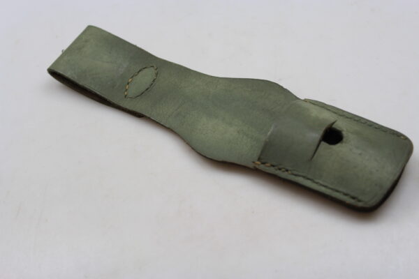 Taschetta in cuoio grigio verde per fodero della baionetta 91 della Seconda Guerra Mondiale. Usata, buono stato di conservazione.