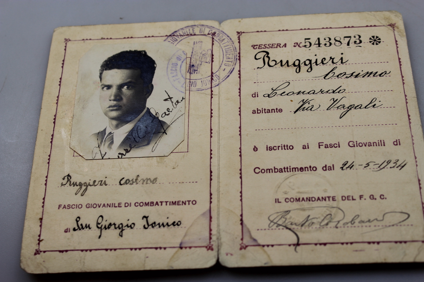 Tessera da iscritto ai Fasci Giovanili di Combattimento per il XIII° anno EF sezione di San Giorgio Ionico (TA), completa di foto. Buono stato di conservazione.