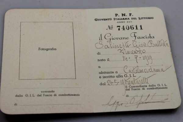 Tessera da iscritto alla GIL “Giovane Fascista” per l’anno XVI° EF nella sezione di Castelmadama (RM). Buono stato di conservazione.