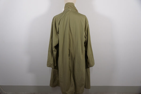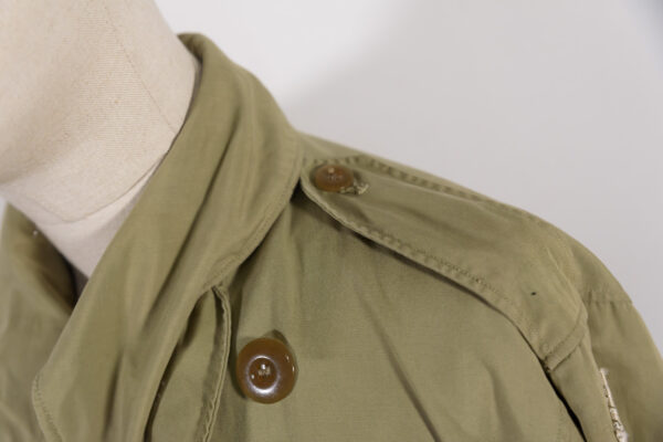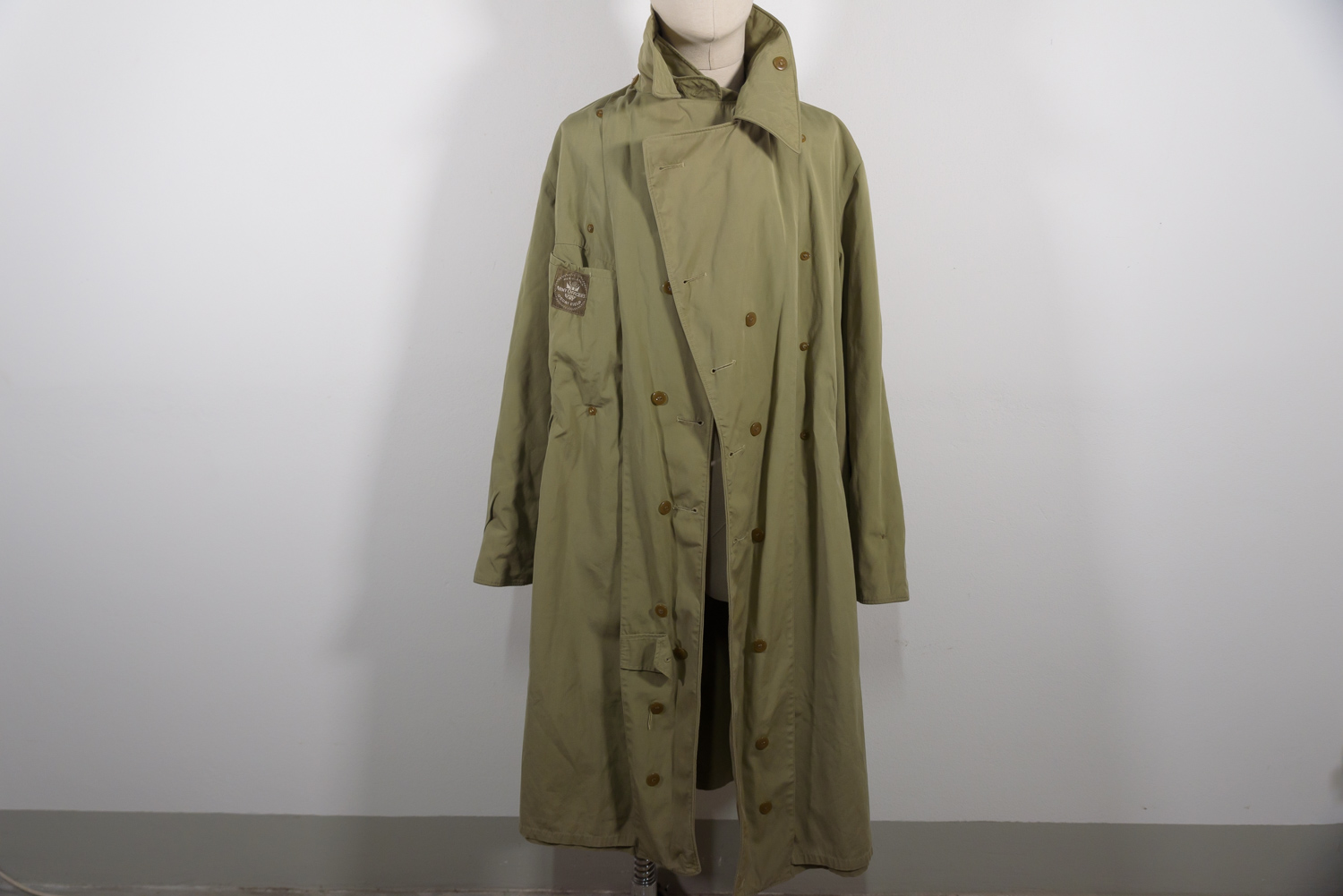 Trench per Ufficiale US Army della Seconda Guerra Mondiale, fatto con lo stesso tessuto della giacca Field M.41, completo di etichetta e di patch sulla manica del 5° Corpo. ( Omaha Beach – Normandia ) Usato, buono stato di conservazione.