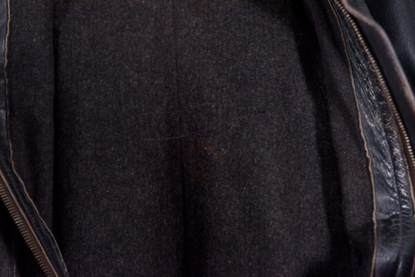 Tutta intera fatta in pelle nera con fodera tipica in panno di lana grigia, in dotazione alla Kriegsmarine nella Seconda Guerra Mondiale. Usata, buono stato di conservazione, zip funzionanti escluse le due in basso all’altezza delle caviglie, entrambe bloccate, vedi foto in dettaglio.
