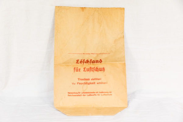 Veramente curioso questo tipo di sacco in carta che veniva usato nei rifugi della Luftschutz per contenere la sabbia anti incendio.La scritta sopra avvisa che era passibile di gravi sanzioni chiunque all’epoca avesse fatto un uso improprio di questo sacco… Condizioni buone.