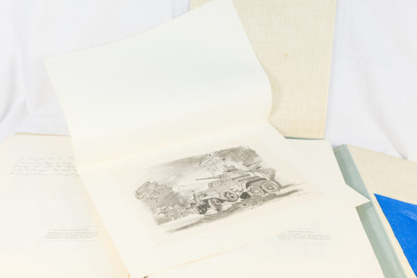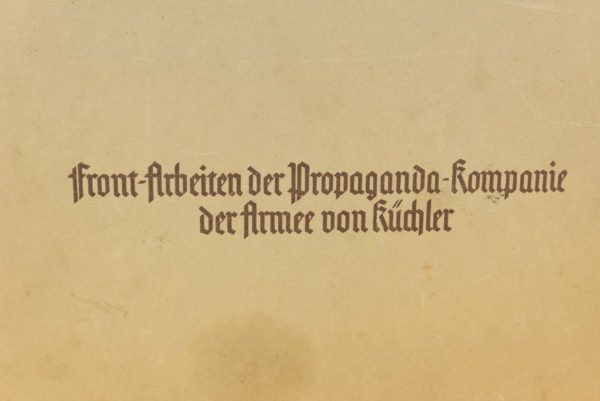 “Kampf und Kunst” a cura del Front Arbeiten der Propaganda Kompanie der armee von Kuchler. Cofanetto ( cm 39×29 ) con #60 stampe dedicate ai Kriegsberichter della Wehrmacht, durante l’avanzata sul Fronte Est. Personalizzazione da parte di un Feldwebel di una unità Sturmartillerie, con qualche sua foto, con i propri attributi di una sua giacca, aquila in Be-Vo “flatwire”,coppia di spalline e litzen, e inoltre con le decorazioni ricevute,KvK con Spade 1^ e 2^ Classe,EK di Seconda Classe, Ostmedaille e Ferita di terza classe. Tutto in buono stato di conservazione.