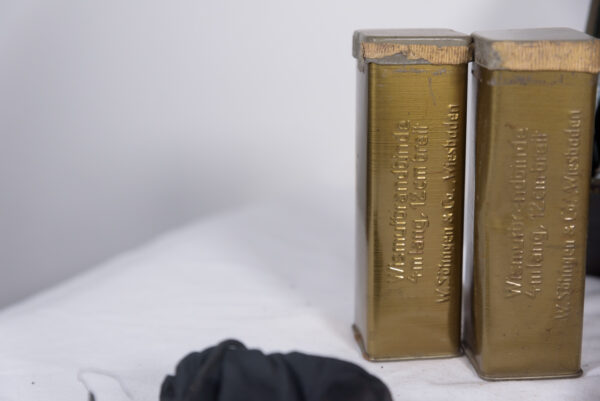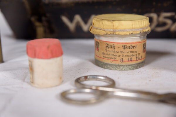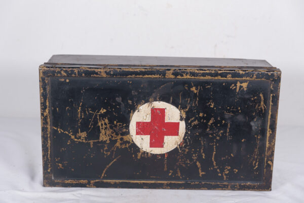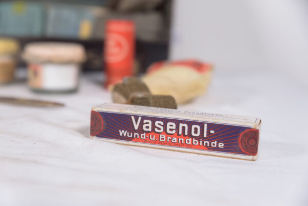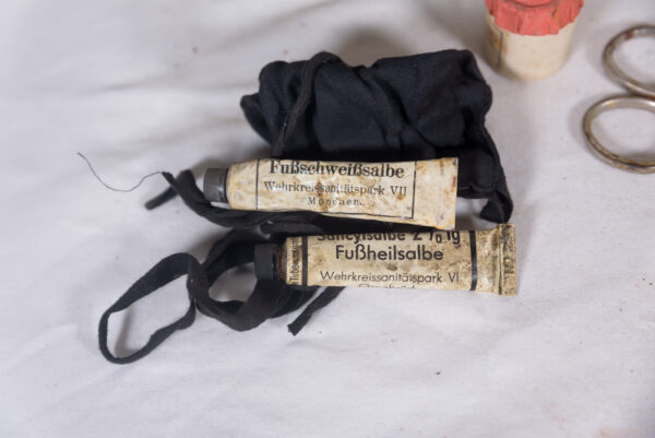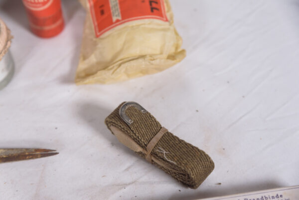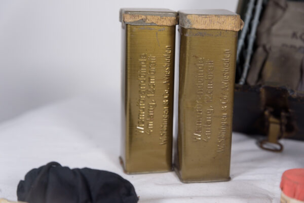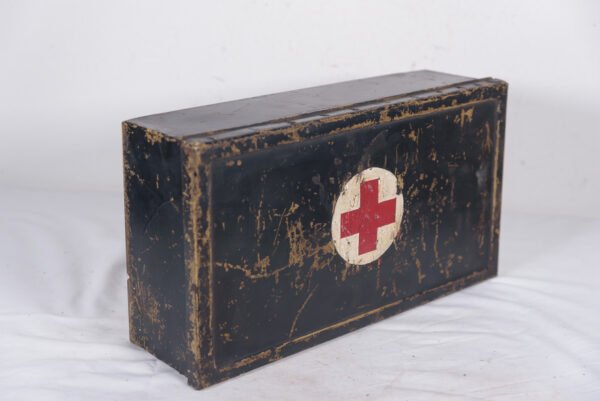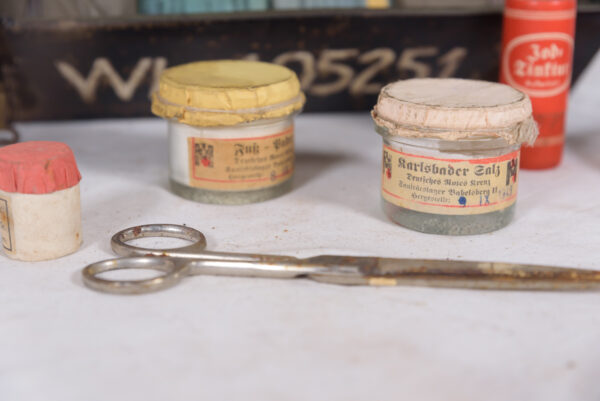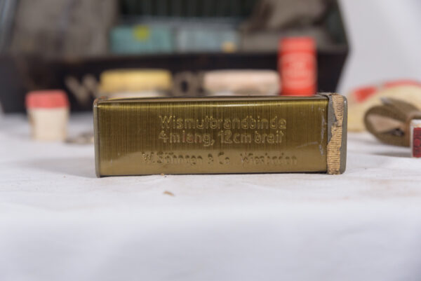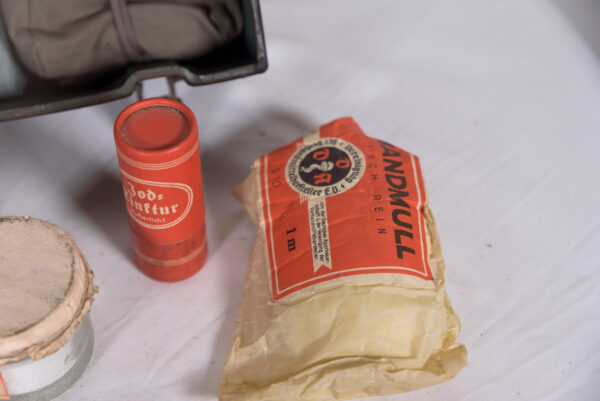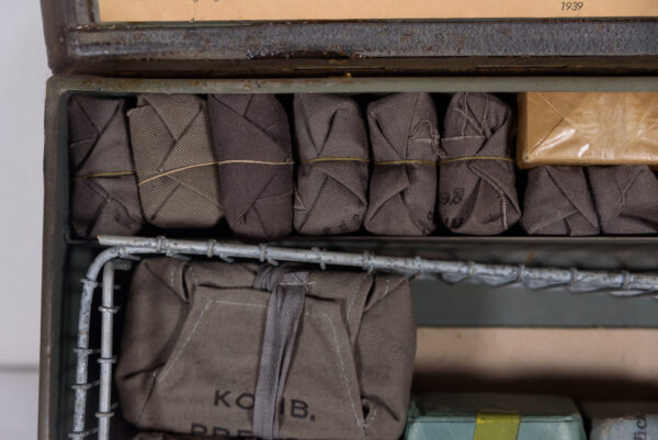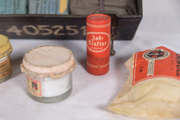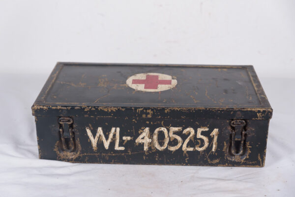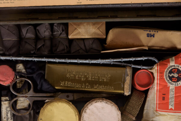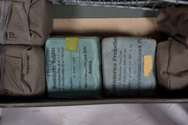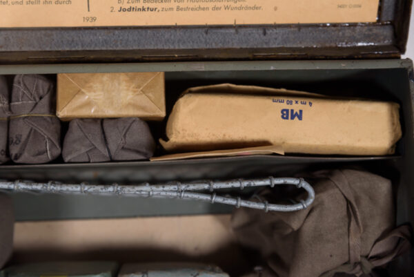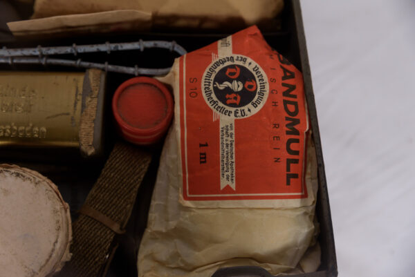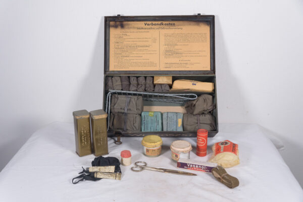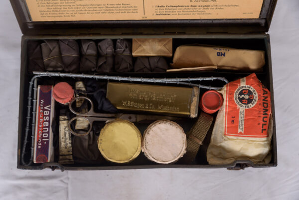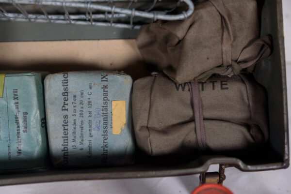 Interessante Verbandksten, ricondizionata due volte. Prima colorazione verde feldgrau, seconda colorazione giallo tropicale, terza colorazione blù scuro con numero di targa di un mezzo della Luftwaffe. Nell’interno presente la lista con il contenuto iniziale con il quale esce fuori dai magazzini della Sanità, che nel corso degli anni vengono cambiati e aggiunti nei vari ricondizionamenti, presente comunque l’accessorio per steccare arti rotti e molti altri prodotti presenti all’inizio e altro materiale aggiunto con l’andar del tepo. Usata, buono stato di conservazione.