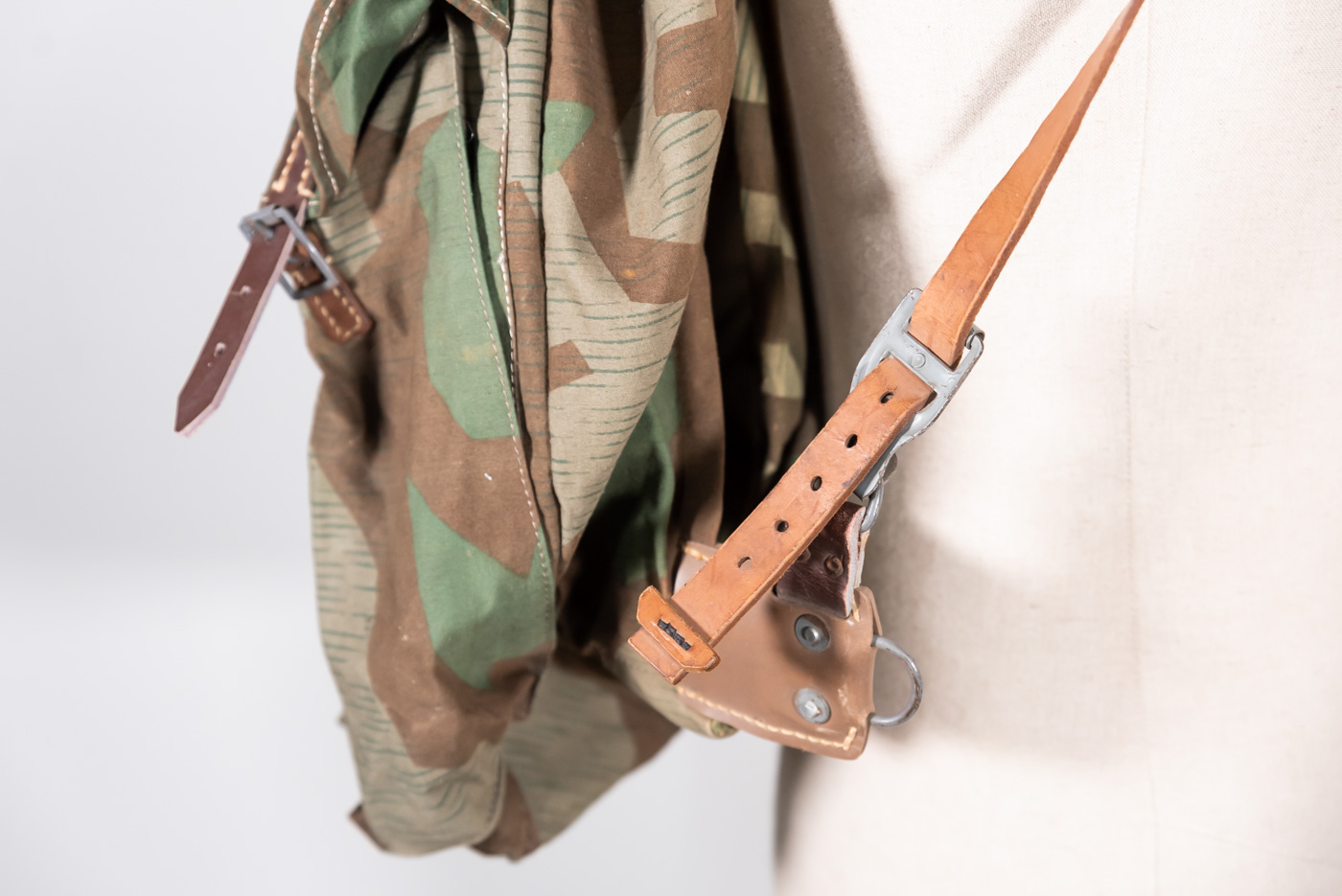 Interessante zaino mimetico Splittertarn, immediatamente postbellico, fatto in stile e con materiali del periodo bellico a cominciare dalla tela mimetica e dalle parti in cuoio, interessante il basto posteriore per facilitare il trasporto spalleggiato in montagna. Poco usato, perfetto stato di conservazione.