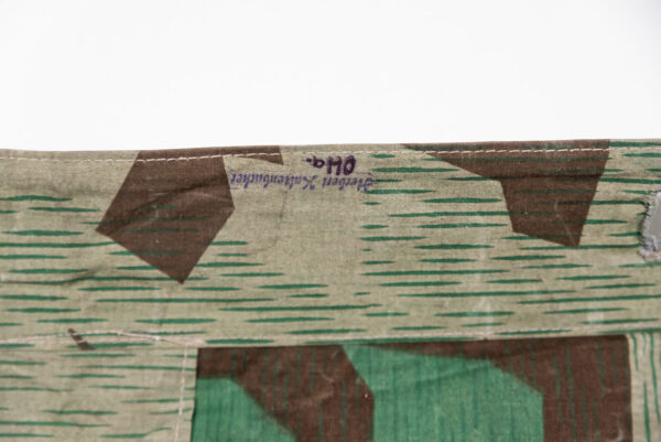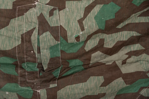 Zeltbahn, telo tenda/poncho individuale, mimetico Splittertarn reversibile con due cromie differenti di tono di colore. Poco usato buono lo stato di conservazione, colori brillanti, non manca nessun bottone, presenti un paio di riparazioni, vedi foto in dettaglio. Marcato con produttore e datato 1942.