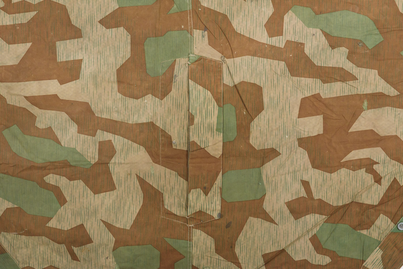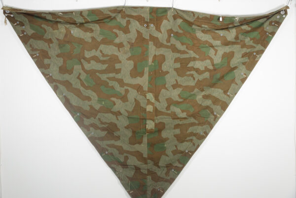 Zeltbahn, telo tenda/poncho individuale, mimetico Splittertarn reversibile con due cromie differenti di tono di colore. Poco usato buono lo stato di conservazione, colori brillanti, non manca nessun bottone, presenti. Marcato con produttore e datato 1942. Usato, buono stato di conservazione.