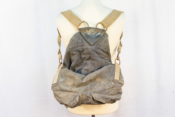Zaino della Luftwaffe, fatto in robusta tela di cotone, con spallacci per il trasporto fatti in canapa in colorazione giallo sabbia, tipica degli equipaggiamenti tropicali/DAK. Marcato con produttore cgx 1942. Usato, buono stato di conservazione.